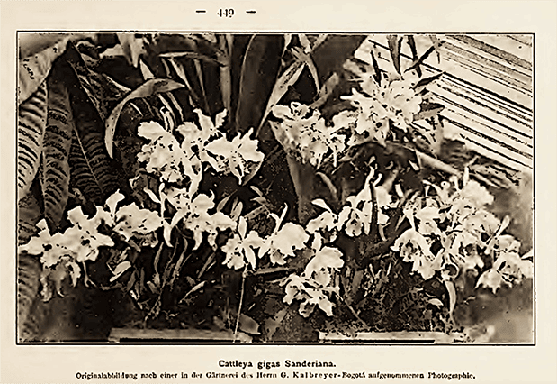 Guillermo Kalbreyer fue un explorador, observador y coleccionista intenso y acertado en sus investigaciones. Colaboró para la revista alemana Möllers Deutsche Gärtner-Zeitung,1 donde escribe en 1899 vol. XIV, en los números 28, 32 y 39 importantes descripciones y observaciones sobre el cuidado del cultivo de las orquídeas y sus envíos a Europa, además que explica minuciosamente las condiciones eco-fisiológicas de muchos de los géneros y especies reconocidas por él. Sus tratados Orquídeas Colombianas I, II y III son sustanciales y aclaradores, inicia anotando el atraso de la “orquídeo-cultura” en Alemania con relación a Inglaterra y Bélgica e insta a que se le debe prestar mucha más atención y desarrollo. Habla de sus recorridos en Colombia y de su colección y herbario “que está enterrado en Viena por más de 25 años” ya que estuvo en manos del científico alemán Heinrich G. Reichenbach2 y se remite a describir las especies más conocidas puntualizando condiciones naturales y ambientales (temperatura, altitud, precipitación, sustratos y luminosidad) para su desarrollo y crecimiento. Teniendo en cuenta estas apreciaciones reúne a las orquídeas en tres grandes grupos: las de zonas frías (2000-3165 m.s.n.m. +3-18 ºR3), las de zonas moderadas o templadas (1650-2350 m.s.n.m. + 11-21ºR) y las de zonas cálidas o zona caliente respectivamente (1000-1650 m.s.n.m. +15-25ºR).