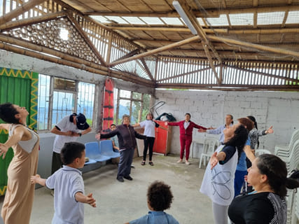Sesión de respiración y conexión, un ejemplo de cómo las personas que integran la Comunidad de Cuidado Compasivo “Todos somos Uno, gestores del cuidado – Vereda Mateguadua, Manizales, mitiga su soledad y fortalece sus vínculos vecinales.